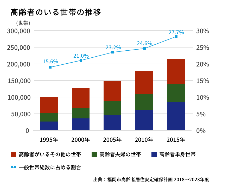 福岡市の高齢者のいる世帯は年々増加しており、特に高齢単身世帯の割合は増えています。買い物支援へのニーズが高まってきていると考えられます。