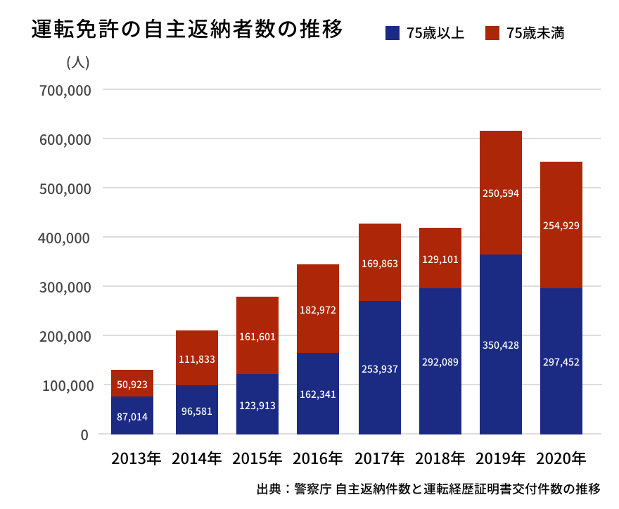 高齢者ドライバーによる運転免許証の自主返納の増加