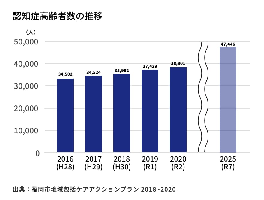 令和7(2025)年には高齢者の5人に1人が認知症になるという推計から、福岡市においては47,446人の方が認知症になると考えられます。単身化・核家族化が進む中、高齢者の単独世帯や高齢者のみ世帯で認知症のある人も増えていくと予測されます。