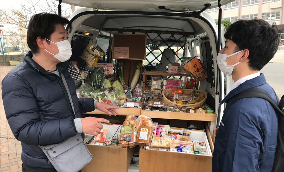 野菜や果物、惣菜、豆腐、お菓子など幅広い商品を移動販売という形で販売し、買い物にお困りの方への買い物支援にご協力いただいています。